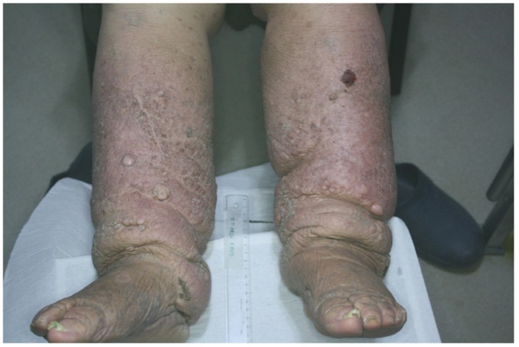 Es una forma de hinchazón de las piernas y los pies que se acompaña por alteraciones de la piel y deformidad; es conocida por ser irreversible. Su forma inicial, el linfedema (un tipo de hinchazón), es difícil de manejar y su tratamiento frecuentemente fracasa en evitar su progreso: se trata de cuidados de la piel y compresión con vendajes o prendas; hay algunas cirugías que pueden hacerse en las etapas tempranas y no hay medicamentos para esta condición; los diuréticos, usados en casos de retención de líquidos, son inútiles en estos casos.