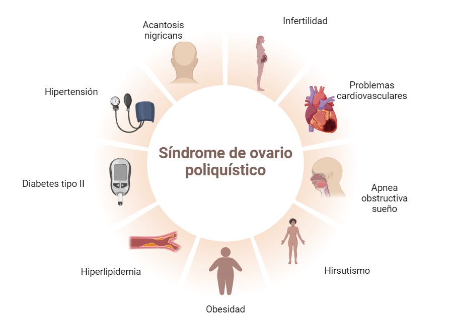 El Síndrome de Ovario Poliquístico (SOP) es una condición caracterizada por desequilibrios hormonales que pueden llevar a ciclos menstruales irregulares, exceso de hormonas sexuales masculinas y la presencia de múltiples quistes en los ovarios; esta condición afecta a un considerable número de mujeres en todo el mundo y México no es la excepción: entre el 21% y el 22% de las mujeres mexicanas pueden estar afectadas por esta condición, que es una de las principales causas de infertilidad debido a la anovulación, presente en hasta el 70% de los casos. Además de su impacto en la fertilidad, el SOP también está relacionado con problemas cardiovasculares y riesgos metabólicos, como la resistencia a la insulina, aumentando así la probabilidad de desarrollar diabetes tipo 2 (Figura 1).