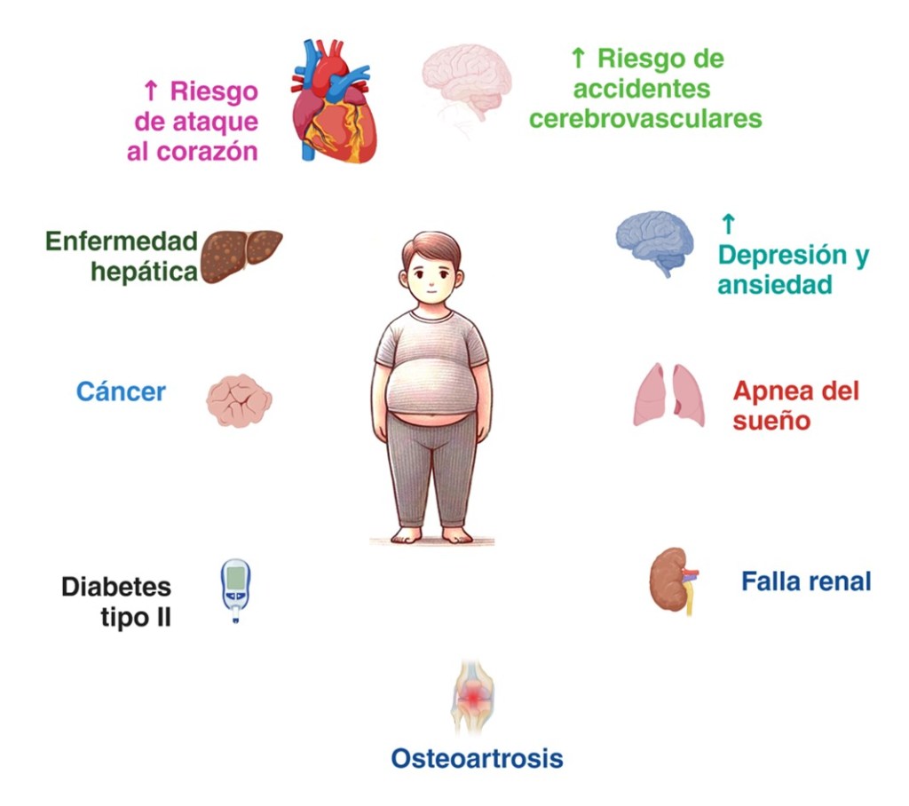 La obesidad no sólo se refleja en el peso, sino que también trae consigo un estado conocido como resistencia a la insulina: un estado en el que las células del hígado, el tejido adiposo y el músculo, no responden adecuadamente a esta hormona, la cual se encarga de regular el metabolismo de los carbohidratos y las grasas; esta resistencia puede ser un factor clave para el desarrollo de diabetes tipo 2. En el mismo tenor, la obesidad puede causar problemas adicionales como enfermedades de los riñones e hígado, problemas respiratorios, ciertos tipos de cáncer y afectar la salud mental (Figura 1).