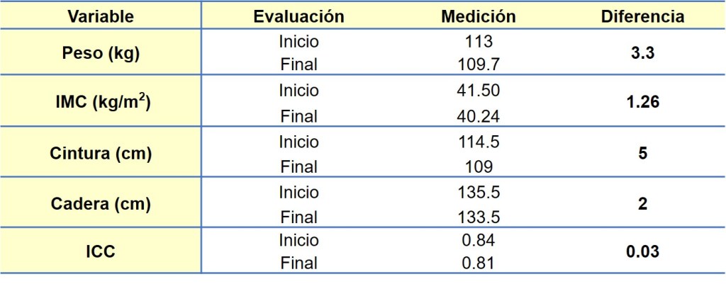 En la evaluación inicial, la paciente fue clasificada con obesidad grado III, según su IMC inicial de 41.50 kg/m2; el ICC se encontró en el límite alto de lo normal (Tabla 1), mientras que los valores de glucosa (117.91 mg/dl) e insulina (34.1 U/ml) estaban fuera del rango normal (70 a 100 mg/dl para la glucosa y 5 a 25 U/ml para la insulina) (Figura 2).