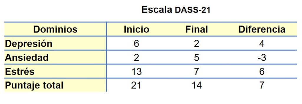 También se aplicó el cuestionario DASS-21 (Tabla 2), por sus siglas en inglés. Este cuestionario permite medir de manera rápida, el grado de depresión, ansiedad y estres. Respecto de sus síntomas mentales, la paciente se quejaba de enojo hacia su hijo y sus hermanos por dificultades familiares; también refirió vergüenza durante el sexo, por su peso. Dentro de los síntomas generales, refirió un apetito voraz con incapacidad para controlarse, así como deseo de dulces, chocolate y refrescos. Presentaba insomnio, caracterizado por dificultad para volver a conciliar el sueño después de levantarse para orinar, presentando sueño no reparador, bostezos y somnolencia diurna. Por último, entre los síntomas particulares, se quejaba de dolor de cabeza severo, provocado por el enojo y el consumo de chocolate; también padecía distensión o hinchazón del abdomen durante la menstruación. Con base a la evaluación inicial, la paciente recibió, Lycopodium clavatum (Lyc.) 7LM cada 12 horas.