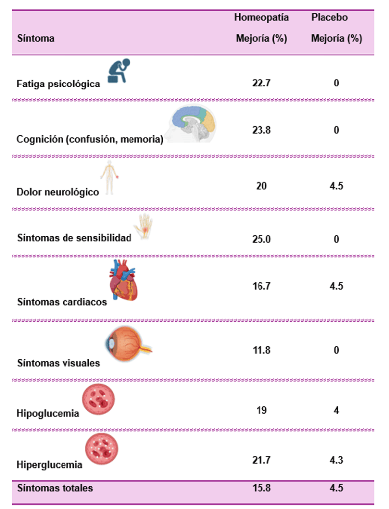 Además, el cuestionario DSC-R (Tabla 2) mostró que quienes recibieron homeopatía se sintieron mejor en varios aspectos. Por ejemplo, presentaron una reducción en la fatiga mental, mejor memoria, disminución de la confusión y alivio del dolor o molestias en los nervios, así como una reducción de síntomas relacionados con la hipo e hiperglucemia, tales como mal humor, irritabilidad, sed y boca seca. Estas mejoras oscilaron entre un 19 % y un 25 % en dichos síntomas. En total, el grupo tratado con homeopatía presentó una reducción del 15.8 % en los síntomas, mientras que el grupo con placebo solo mostró una mejoría del 4.5 %. Los medicamentos homeopáticos más recetados en este estudio fueron Calcarea carbonica, Thuja occidentalis, Sulphur y Natrum muriaticum (Guha et al., 2024).